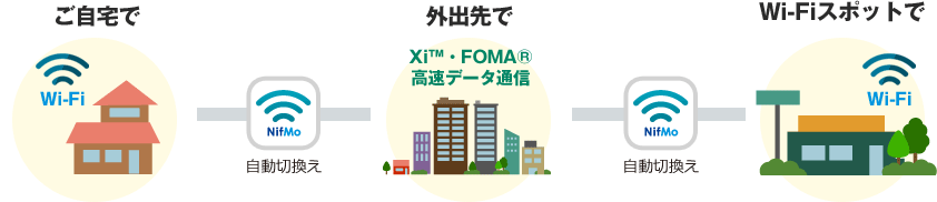 宅内無線LANやWi-Fiスポットへの接続は、専用アプリ「NifMo コネクト」におまかせ。